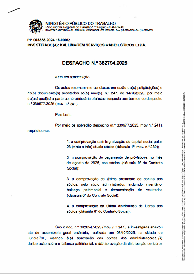 Fora a entrega de inúmeros comprovantes bancários e cópias de declarações ao imposto de renda sem os recibos de entrega. Desse modo, a empresa de radiologia tem até 20 dias para realizar a entrega de todos os itens solicitados para que o Ministério Público do Trabalho (MPT) possa concluir as investigações.
