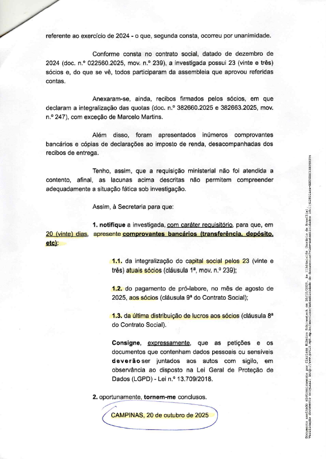 A empresa havia sido notificada para comprovar o seu capital social, o pagamento de pró-labore do mês de agosto de 2025 aos seus 23 sócios. Além disso, solicitou a última prestação de contas aos sócios, mencionando o inventário, balanço patrimonial e demonstração de resultados.